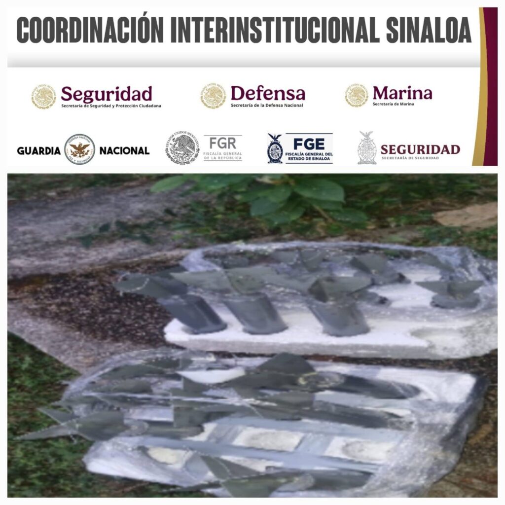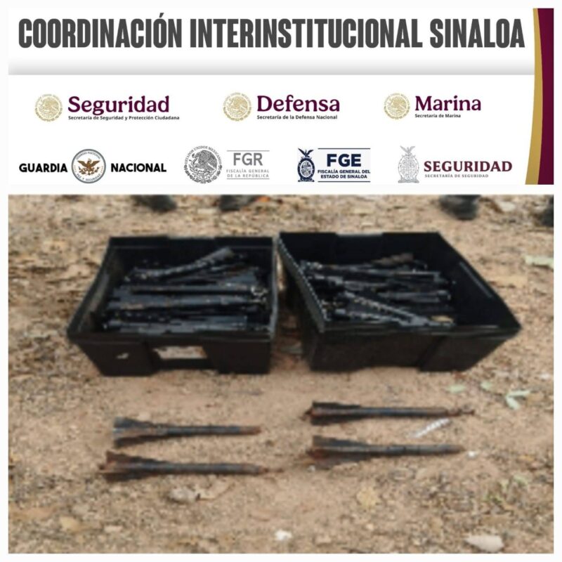 La Guayanera, Concordia, 18 de enero de 2025. Elementos del Ejército Mexicano, Guardia Nacional, Secretaría de Marina y Secretaría de Seguridad y Protección Ciudadana, aseguraron y desactivaron 98 artefactos explosivos de fabricación artesanal, en diversos operativos terrestres realizados en las comunidades de La Guayanera y La Capilla, municipio de Concordia, Sinaloa.