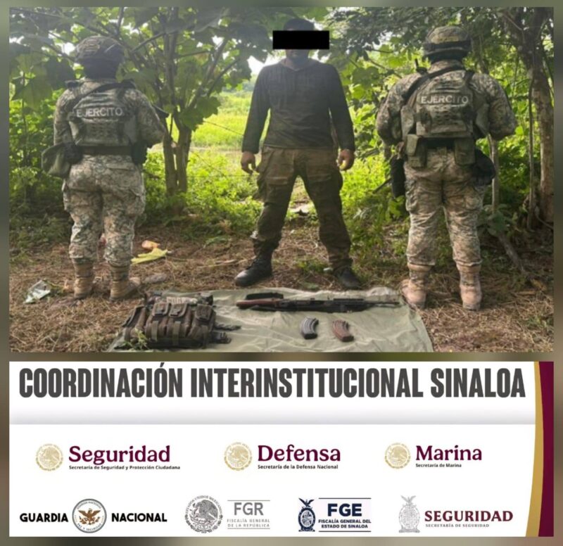 Escuinapa, Sinaloa, 6 de septiembre de 2025. Elementos del Ejército Mexicano, con apoyo del grupo Interinstitucional, detuvieron a un hombre armado en Escuinapa, inhabilitaron campamentos a delincuentes y aseguraron armas, drones, explosivos y equipos tácticos en la sindicatura de Tepuche y en los municipios de San Ignacio, Culiacán , Concordia y Badiraguato, durante diversos operativos de reconocimiento, dió a conocer la Secretaría de Seguridad Pública de Sinaloa.
