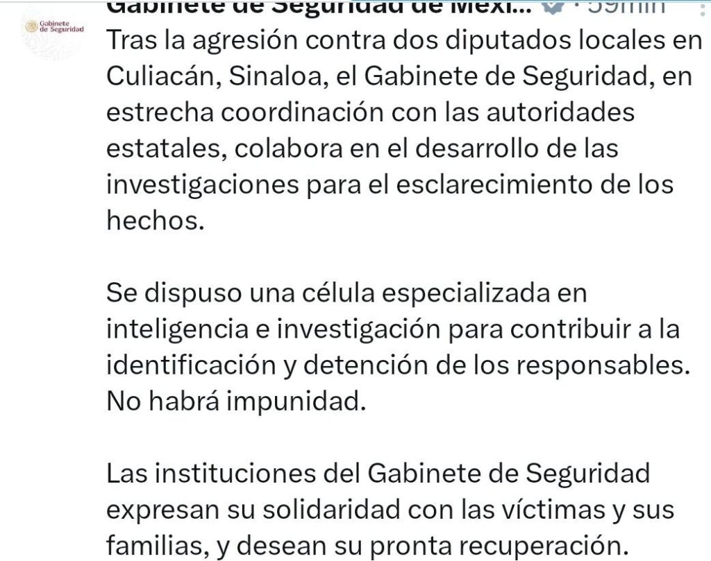 Dijo además que en respuesta a su solicitud, y por órdenes de la presidenta Claudia Sheinbaum Pardo, el Gabinete de Seguridad Nacional, informó la designación de una célula especializada en labores de inteligencia para dar con el paradero de los delincuentes y ponerlos ante la Ley.