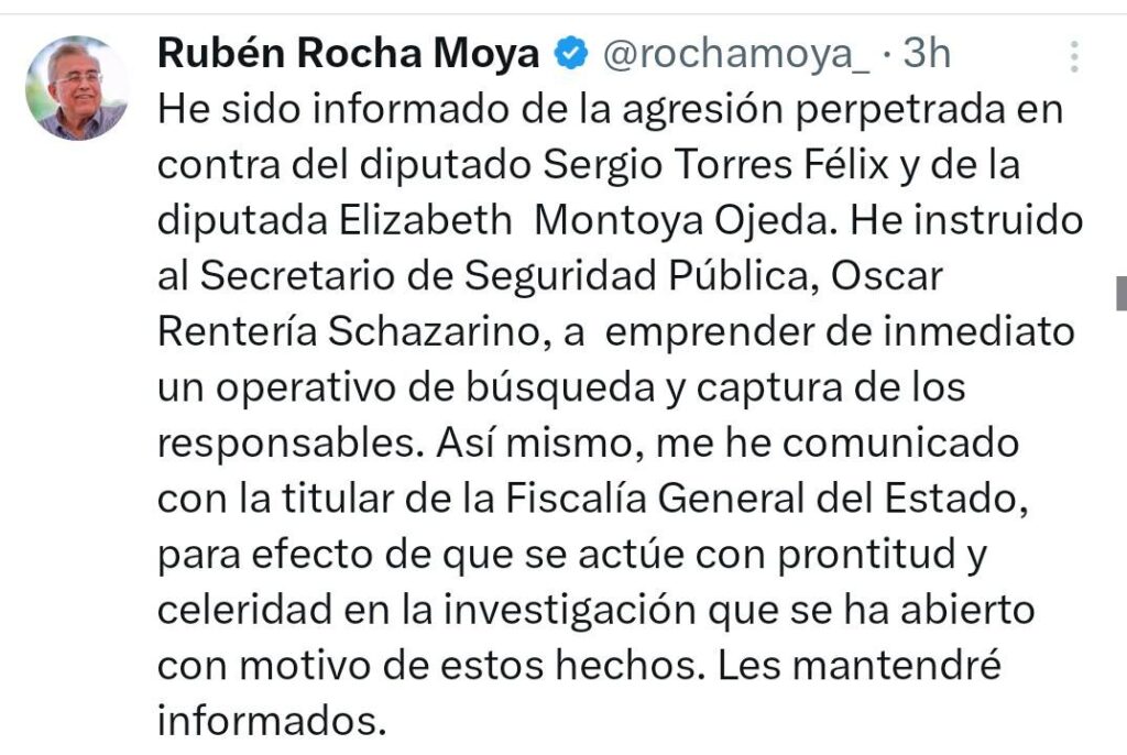 Culiacán, Sinaloa, 28 de enero de 2026. Mientras el gobernador Rubén Rocha Moya se comprometió a seguir trabajando para mejorar las condiciones de seguridad en Sinaloa, el Gabinete de Seguridad Nacional anunció la asignación de una célula especial de Inteligencia Militar para dar con el paradero de los agresores de los diputados Sergio Torres Félix y Elizabeth Montoya Ojeda.