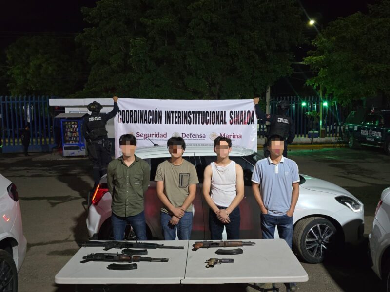 Culiacán, Sinaloa, 26 de septiembre de 2025. Cuatro jóvenes fueron detenidos con armas de uso exclusivo del Ejército, municiones y autos robados, durante un operativo realizado por el Grupo Interinstitucional en la colonia Pedregal del Humaya, al norte de Culiacán.