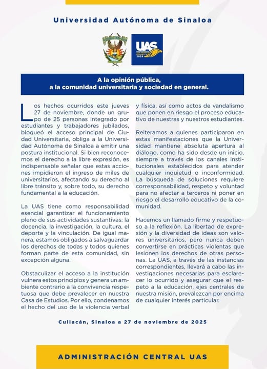 nte los hechos ocurridos este jueves en el acceso principal de Ciudad Universitaria por parte de un grupo de estudiantes y trabajadores jubilados, la Universidad Autónoma de Sinaloa mantiene firme su postura de respeto a la libre expresión y apertura al diálogo. Sin embargo, hacemos un llamado a la no violencia verbal, actos de vandalismo y el trastocar las actividades sustantivas de la Casa Rosalina, así como la afectación a miles de universitarios al impedir el acceso a las instalaciones.