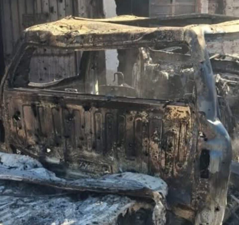 En una de las calles de la colonia El Roblito, encontraron una camioneta incendiada y con múltiples impactos de bala y en su interior, los cuerpos calcinados de al menos tres personas del sexo masculino.