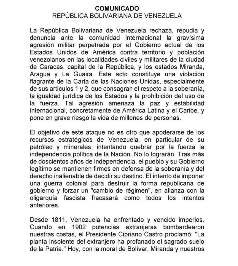 Condenó la presencia de tropas estadounidenses a Venezuela como una agresión al territorio y pueblo venezolano y llamó a la comunidad política y sociedad civil a tomar las armas para defenderse.