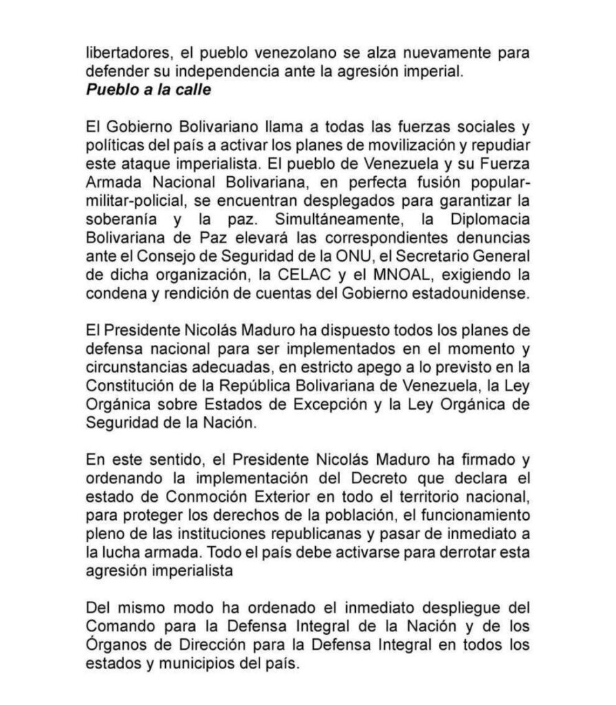 En un manifiesto dirigido a la comunidad internacional, Maduro señaló que la llegada de aviones y tanques del ejército estadounidense a Venezuela, constituyen una violación flagrante al derecho internacional y como tal será denunciada ante el mundo.