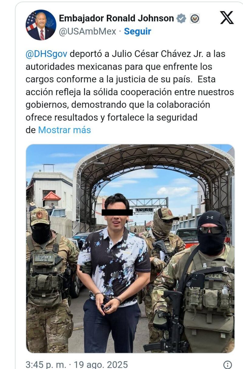 Hermosillo, Sonora, 18 de agosto de 2025. El embajador de Estados Unidos en México, Ronald Johnson, celebró la deportación a México del pugilista mexicano Julio César Chávez Jr, quien esta mañana arribó a la ciudad de Hermosillo, Sonora.