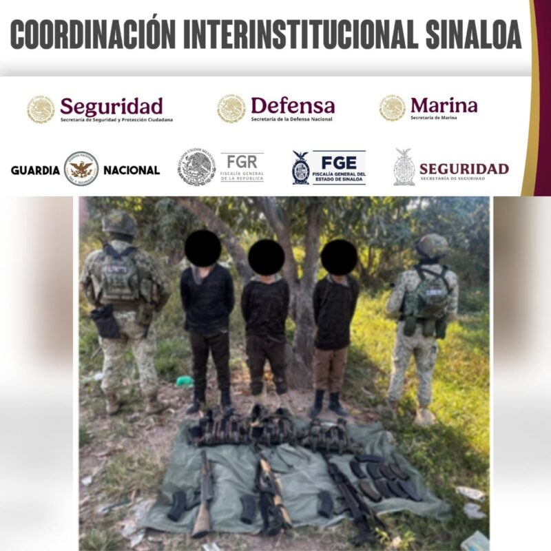 Escuinapa, Sinaloa, 23 de diciembre de 2025. Elementos del Ejército Mexicano, en coordinación con la Guardia Nacional, la Secretaría de Marina y la Secretaría de Seguridad y Protección Ciudadana, la Fiscalía General del Estado y la Secretaría de Seguridad Pública, detuvieron a tres hombres armados a quienes aseguraron varios equipos constitutivos de delito