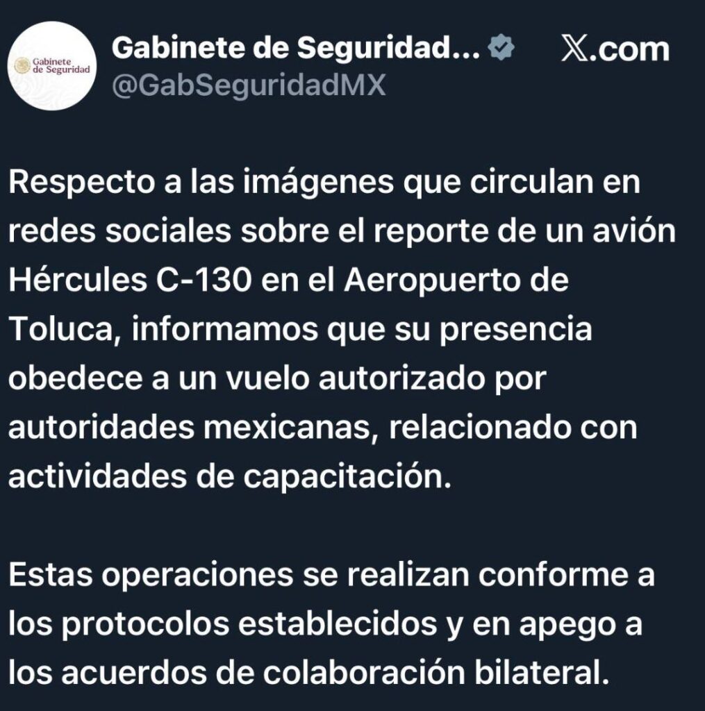 Con lo anterior, las autoridades de Seguridad de México, responden al conjunto de comentarios y especulaciones destacados desde este sábado por la tarde, ante la presencia de la aeronave de las fuerzas armadas de los Estados Unidos, en el aeropuerto de la ciudad de Toluca, Estado de México.