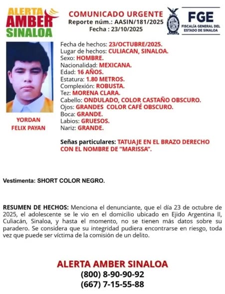 Los datos aportados por los familiares de los jóvenes, señalan que desde este 23 de octubre, perdieron todo contacto con Jordan Félix, de 16 años de edad y originario del ejido Argentina II, de esta ciudad de Culiacán.