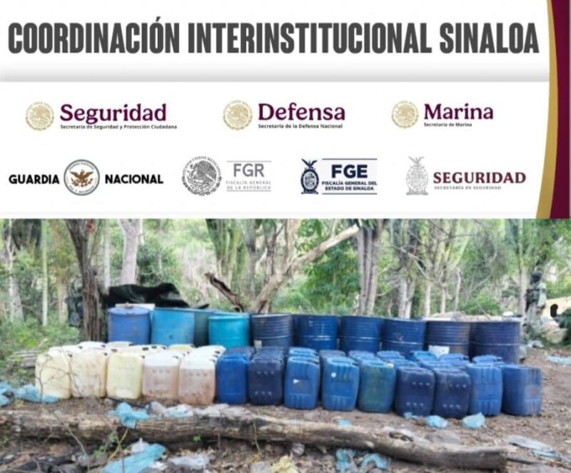 Corral Viejo, Culiacán, Sinaloa, 25 de octubre de 2025. Como parte del operativo «Búsqueda, Localización y Destrucción de Laboratorios Clandestinos», elementos del Ejército Mexicano coordinados con la Guardia Nacional, Secretaría de Marina, Secretaría de Seguridad y Protección Ciudadana y la Fiscalía General de la República y del Estado, aseguraron e inhabilitaron una enorme bodega-laboratorio de almacenamiento de precursores químicos en la comunidad de Corral Viejo, municipio de Culiacán.