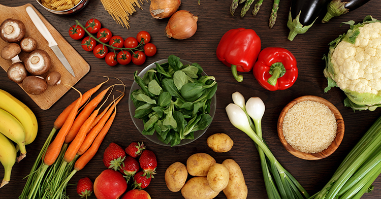 Photo of a table top full of fresh vegetables, fruit, and other healthy foods.