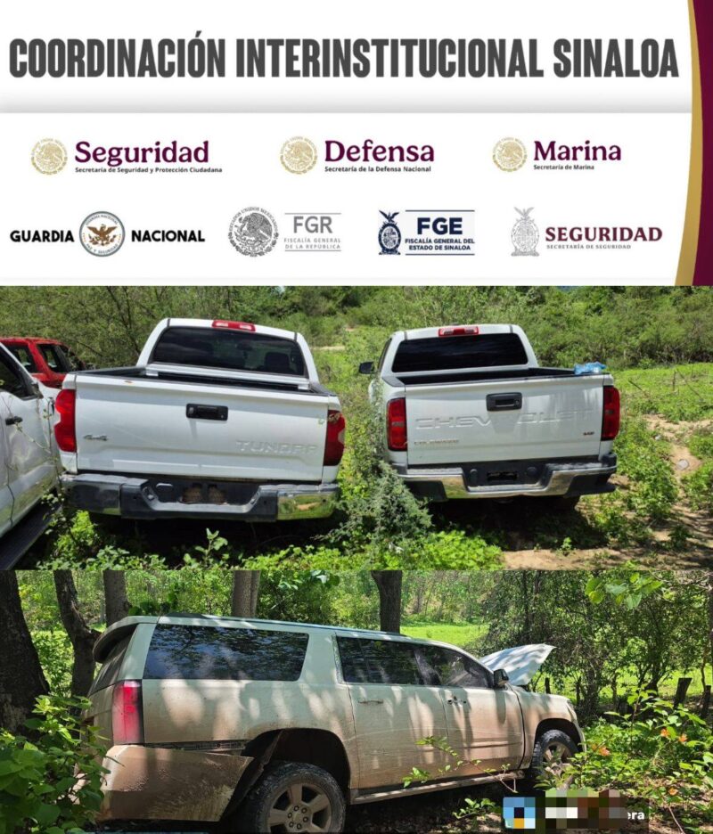 Cosalá, Sinaloa, 7 de julio 2025. Luego de diversas labores de Inteligencia terrestre y aérea, elementos de la Secretaría de Marina, en coordinación con el Ejército Mexicano, aseguraron nueve vehículos, algunos con blindaje, un fuerte arsenal, equipo táctico y de telecomunicaciones en el poblado de Ipucha y en las inmediaciones de la cabecera municipal de Cosalá.