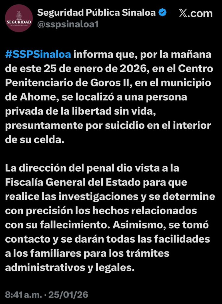 Goros II, Ahome, Sinaloa, 25 de enero de 2026. Un hombre que se encontraba privado de su libertad, fue encontrado sin vida esta mañana, en el interior de su celda, en el centro penitenciario Goros II, dió a conocer la Secretaría de Seguridad Pública.