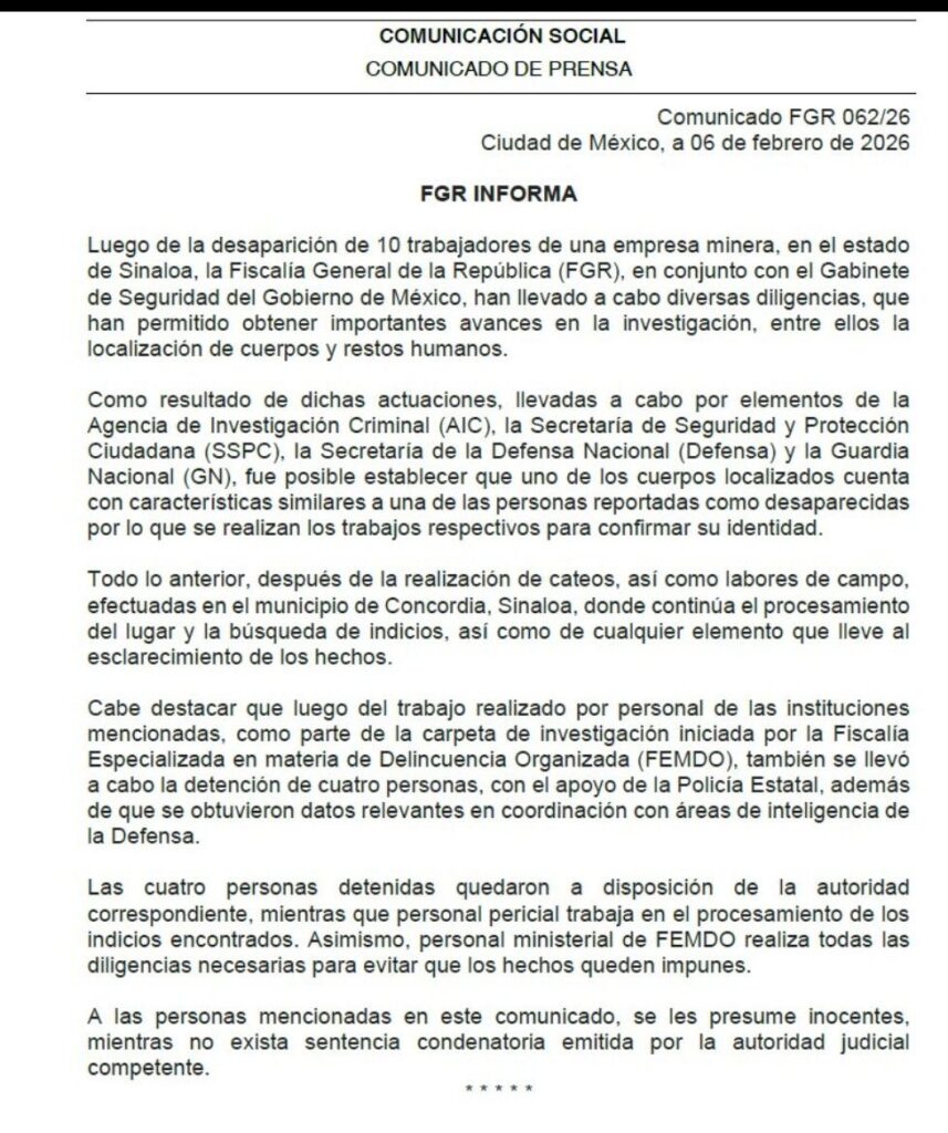 «Luego de la desaparición de 10 trabajadores de una empresa minera en el estado de Sinaloa, la Fiscalía General de la República (FGR), en conjunto con el Gabinete de Seguridad del Gobierno de México, han llevado a cabo diversas diligencias que han permitido obtener importantes avances en la investigación, entre estos la localización de restos y cuerpos humanos».