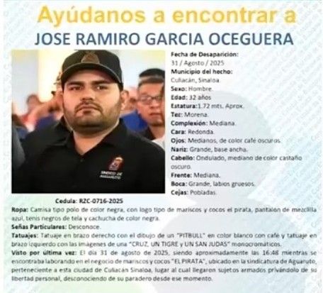 Aguaruto, Sinaloa, 2 de septiembre de 2025. Continúa la búsqueda de José Ramón García Oceguera, Sindico de Aguaruto que este domingo 31 de agosto fue privado de su libertad por varios hombres armados, cuando se encontraba en su negocio de mariscos, ubicado en esa sindicatura.