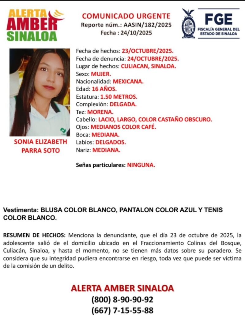 Ella desapareció este jueves 23 de octubre, en el Fraccionamiento Colinas del Bosque, en Culiacán.